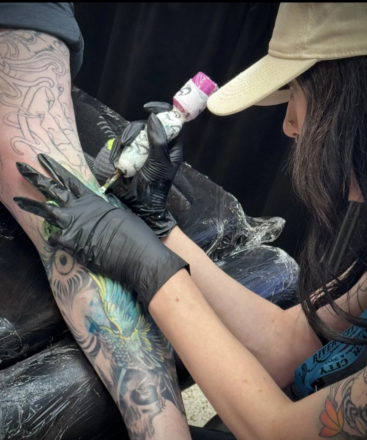 Tattoo artist working on a design in a studio, holding a tattoo machine, wearing gloves.