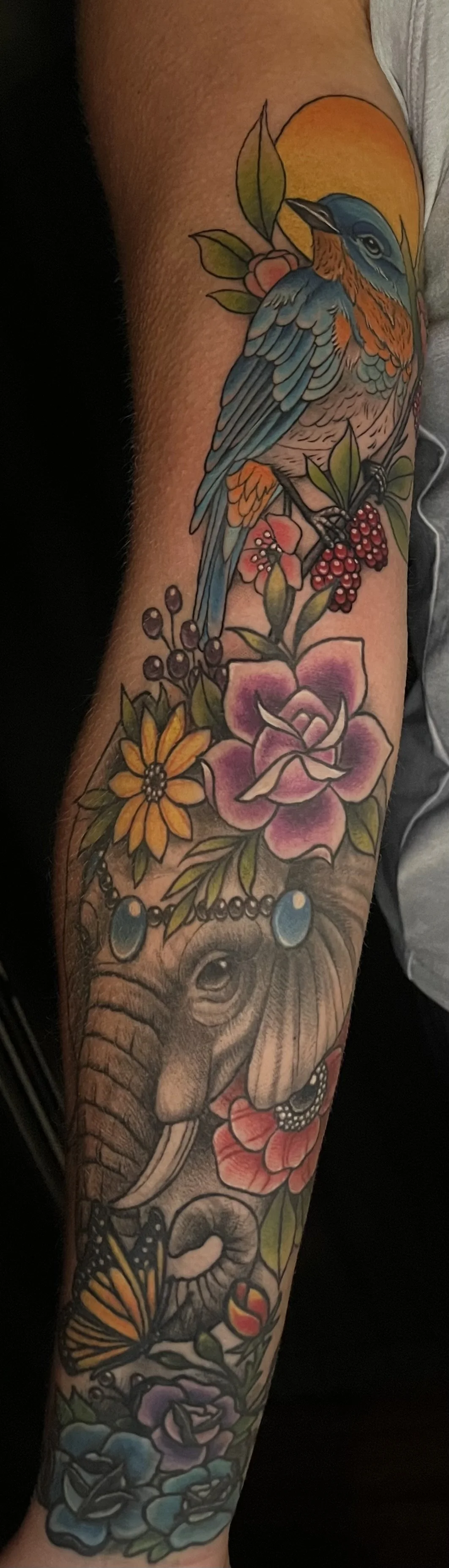 It all begins with an idea. She already had the roses at the bottom. Brittany reworked the roses then added the elephant a few years ago. The bird is the newest addition!