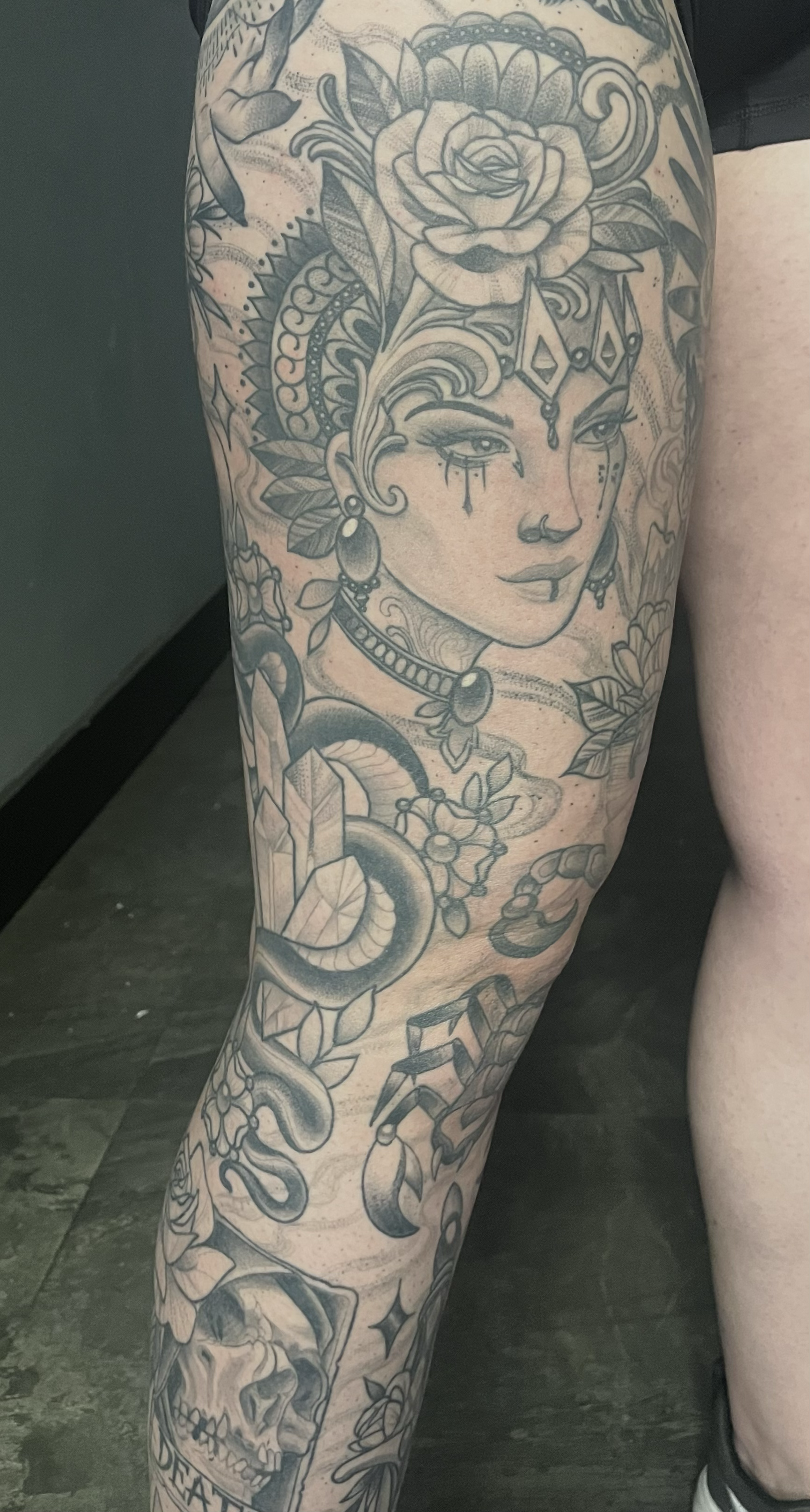 has been bringing art to life on skin for 13 years, with roots as a painter that infuse her work with depth and creativity. Specializing in Neo Traditional, black and gray, and color realism, she crafts bold, intricate designs that tell personal stories. Proud owner of Aptitude Tattoo shop, Brittany transforms ideas into timeless tattoos with precision and passion. Ready for a piece that’s uniquely you? Connect with Brittany at Aptitude Tattoo and book your session!